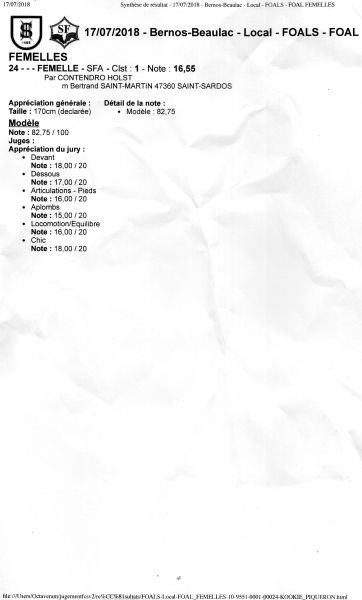 Pouliche très chic possédant un joli modèle, beaucoup de sang, une belle aptitude à l'obstacle et une très bonne locomotion.